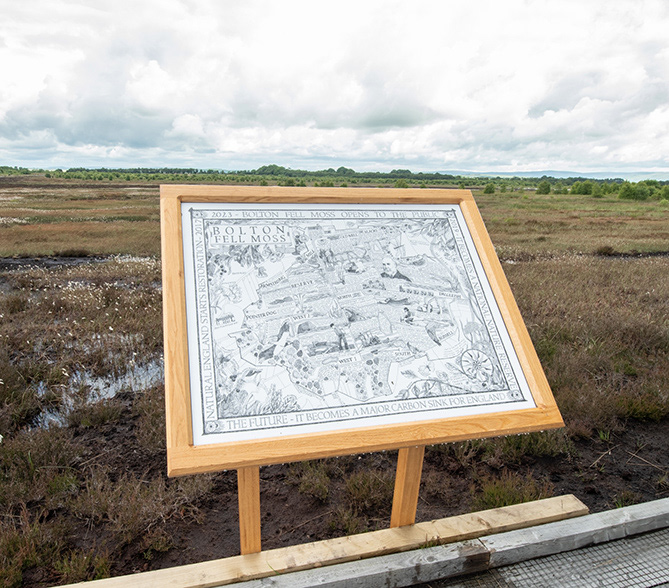 The map shows a landscape layered with stories across time - the peat formation 10,000 years ago, historic domestic cutting for fuel, more recent industrial milling for horticultural peat and the current scientific processes of peat restoration. Alongside these stories are those collected from the people who live near or work on the bog and the voices of local children and their hopes for the future of the Moss fighting climate change as a carbon capture sink.