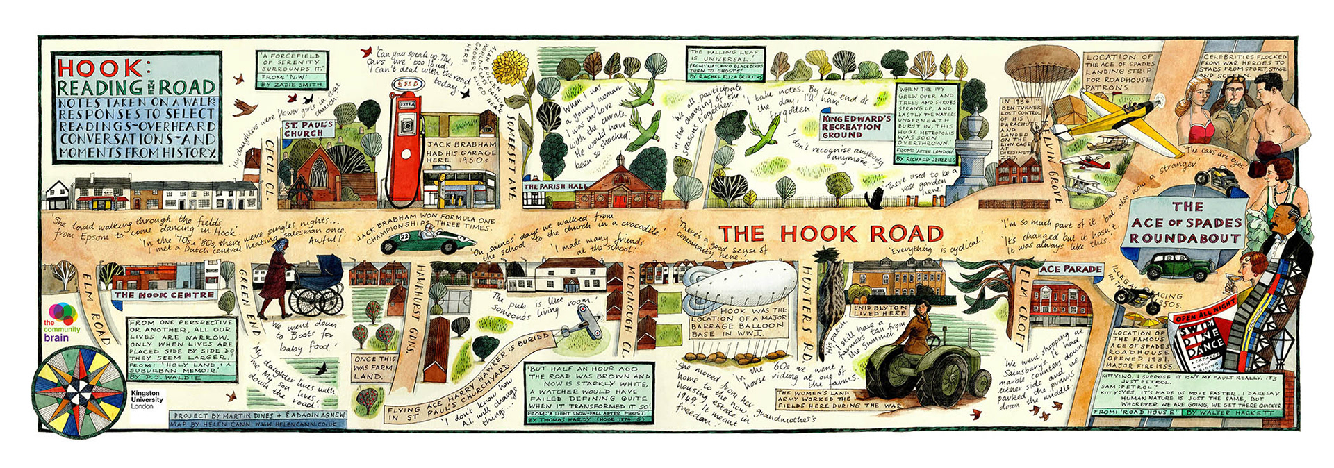 A commission from the Creative Writing Department at Kingston University for their walking, reading and mapping project 'Reading the Road'. I took part in two 'walkshops' in Hook, Surrey with students and community residents and the map grew from the experience. It features points of historical interest with notes of overheard conversations and responses to select readings chosen to reflect the suburban environment.