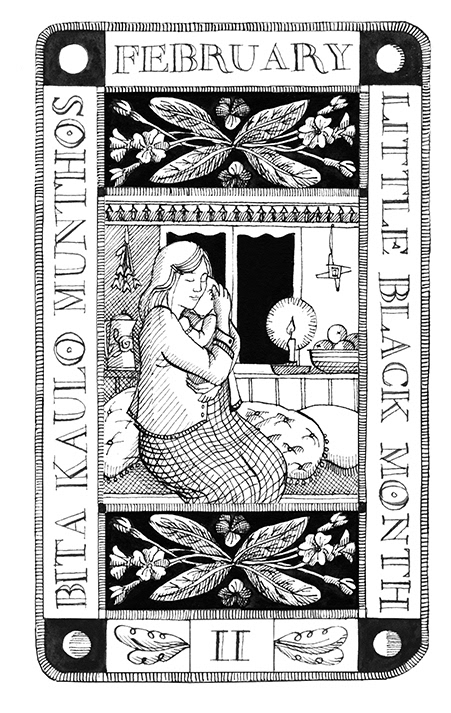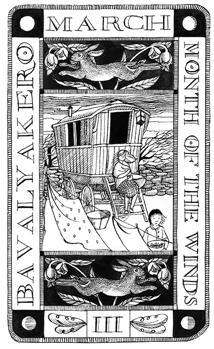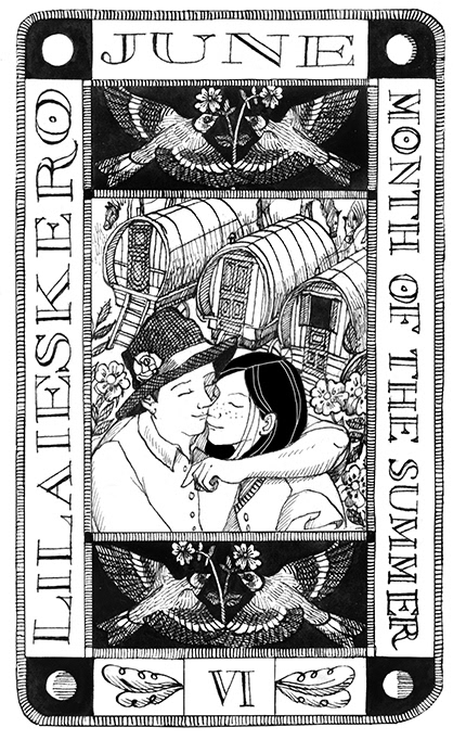 Chapter openers - drawn and hand lettered in pen and ink for Lia Leendertz' best seller 'The Almanac'. The theme of the 2021 Almanac was migration and each chapter opener reflected the life of a Romany woman travelling to horse fairs, cooking outside and helping with the harvests. The design is based on a traditional tarot card format and shows a design for each month with both the English and Romany names.