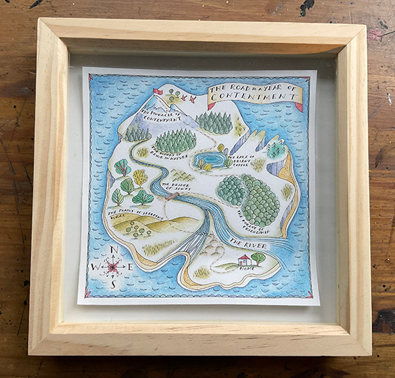A framed map of a 'personal health journey' designed for a corporate 'wellness' retreat. Ink and watercolour wash.