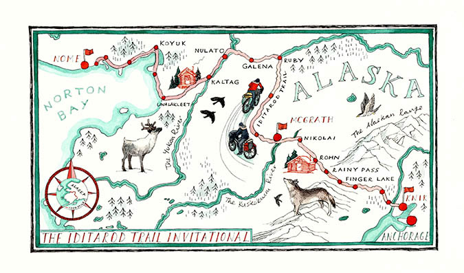 A map of the Iditarod Trail Invitational for the Dartmouth Alumni Magazine illustrating an article about this thousand mile ultramarathon through the snows of Alaska. The magazine goes out to past students of Ivy League Dartmouth College in the U.S.