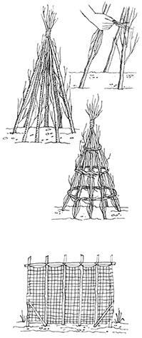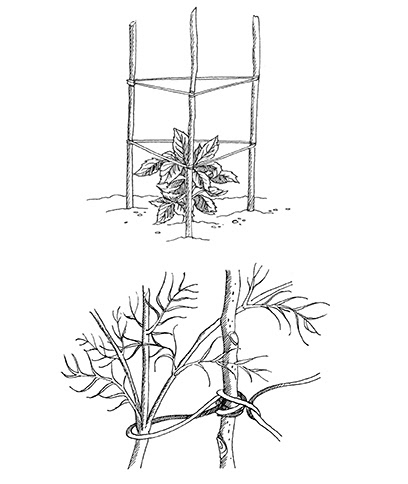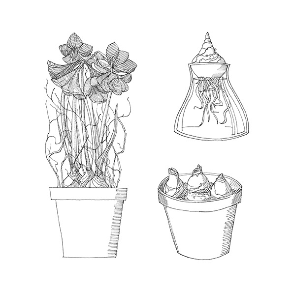 Pen and ink drawings showing a variety of gardening techniques created for the book 'A Year Full of Flowers' by Sarah Raven and published by Bloomsbury.