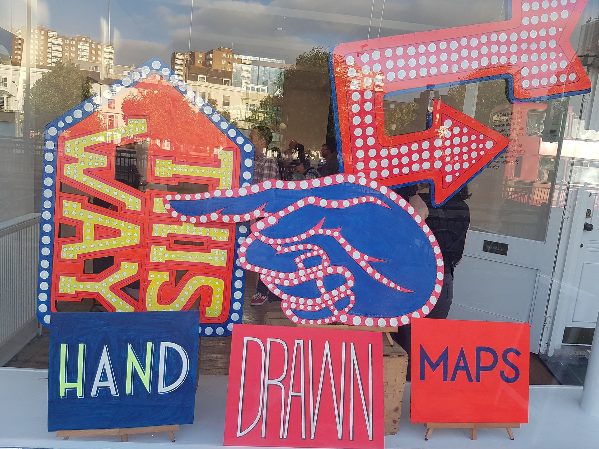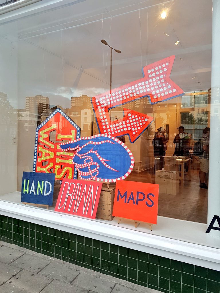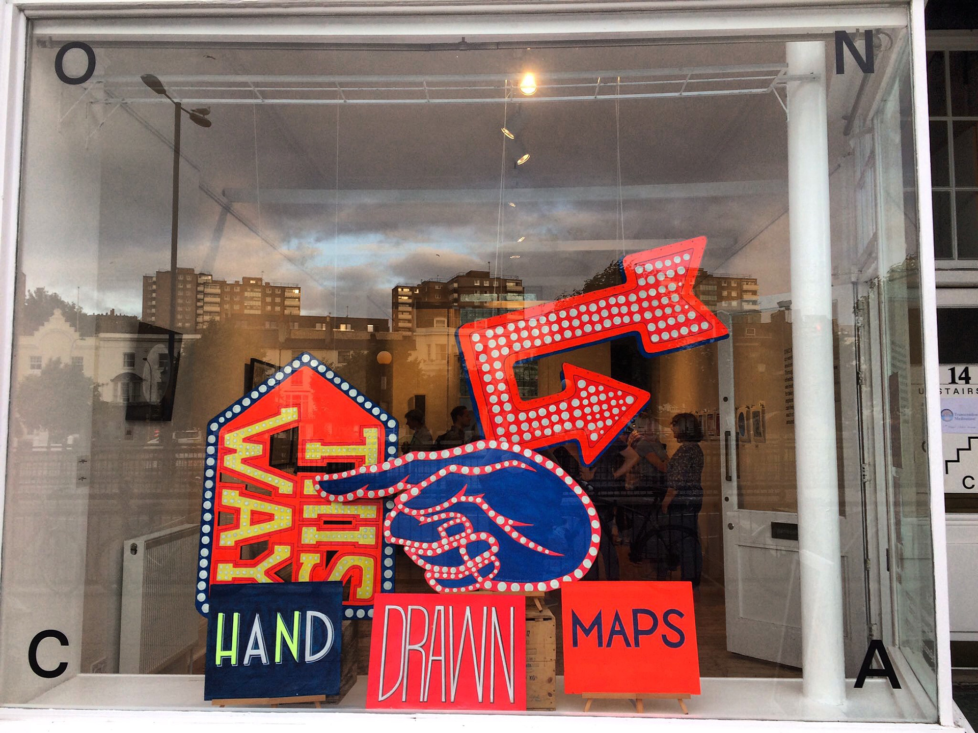 Hand lettered and painted signs for an exhibition window installation at O N C A Gallery. The signs were all painted in acrylic on a variety of surfaces including cardboard, hardboard and mdf. Some were varnished and tacked onto a 2cm deep mdf backing, others were left as they were to add to the lo-fi feel. Fluorescent paint was used on the three large signs to give a 'hand made' neon effect.