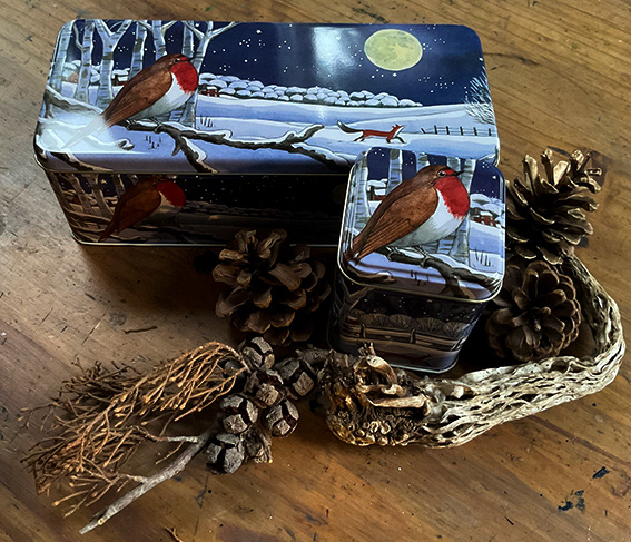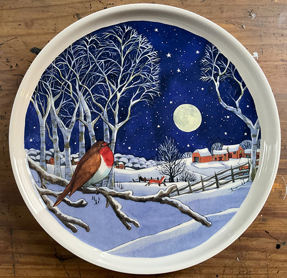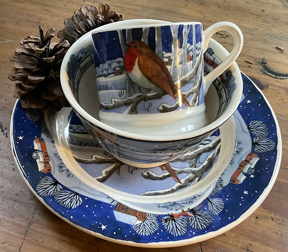 A 'robin in the snow' design for the Midnight Animals homeware collection for Emma Bridgewater - an annual seasonal commission. The design runs across mugs, plates, platters and bowls plus tin boxes, trays and tea towels.
