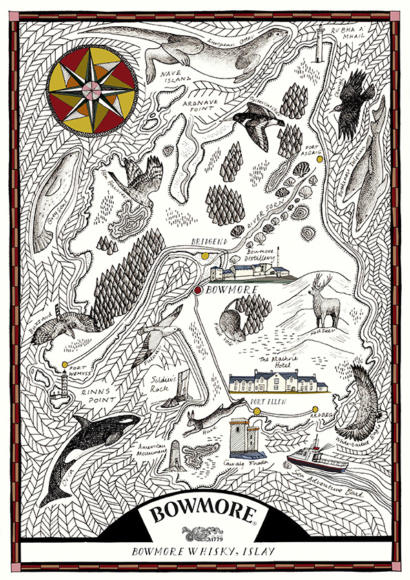 A map of the Scottish island of Islay, commissioned by Sauce Communications on behalf of Bowmore Whisky. The map was included as a fine art print included in a promotional package for journalists on a visit to the distillery.