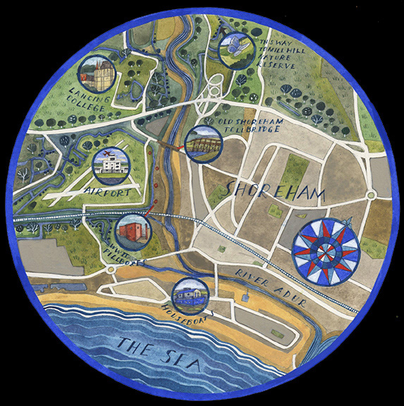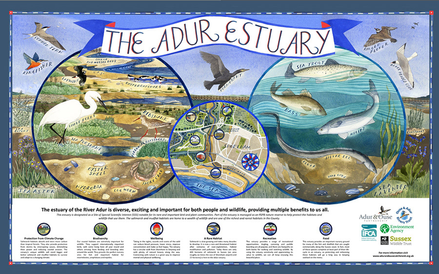 A map of the Adur estuary and its wildlife commissioned as signage by The Ouse and Adur River Trust, The Environment Agency, Sussex Wildlife Trust, The ICFA and the Adur and Ouse Partnership. You can find it alongside the river pathway on the banks of the Adur estuary near Shoreham in Sussex.