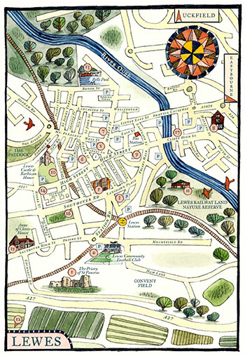 The maps are hand drawn and painted in ink and watercolour. I borrowed the colour palette from the interior of Charleston, home of the Bloomsbury Group - writers, artists and philosophers - who had a strong connection with Lewes in the early 20th century.